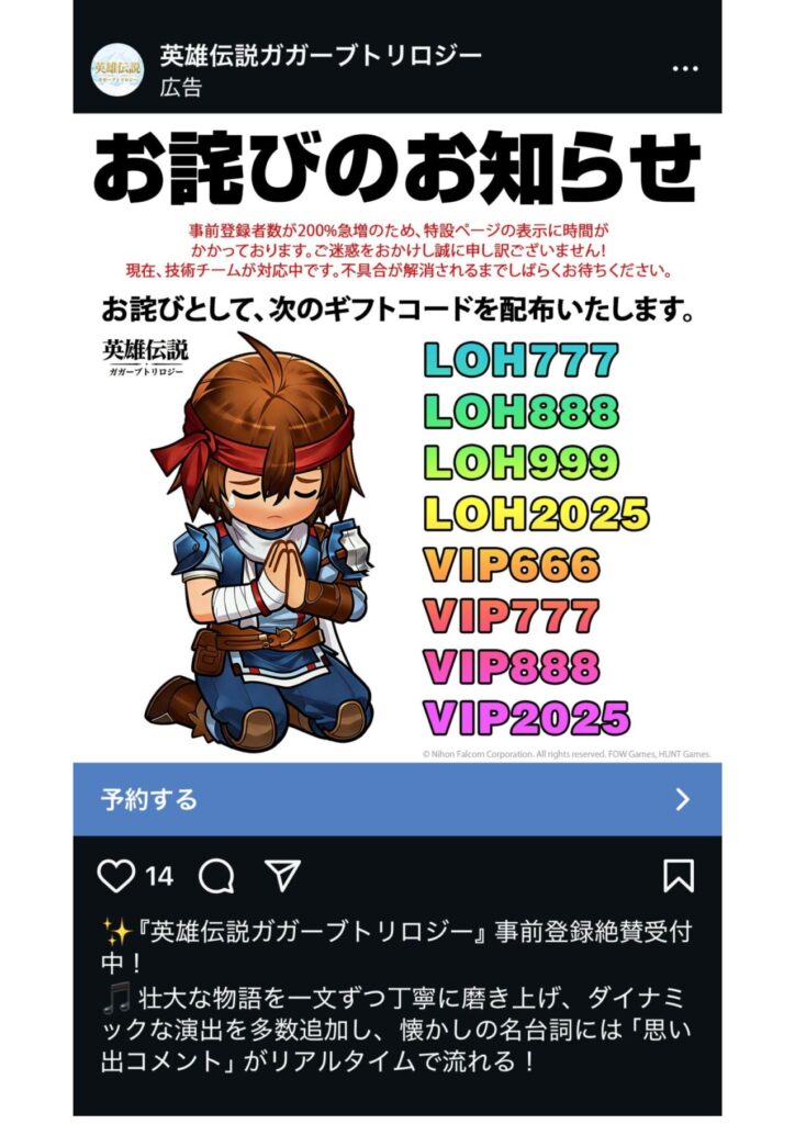 英雄伝説ガガーブトリロジーのギフトコードは、公式XやInstagram・ディスコード・ゲーム内のメールから入手できる可能性がある為、こまめに確認しましょう。