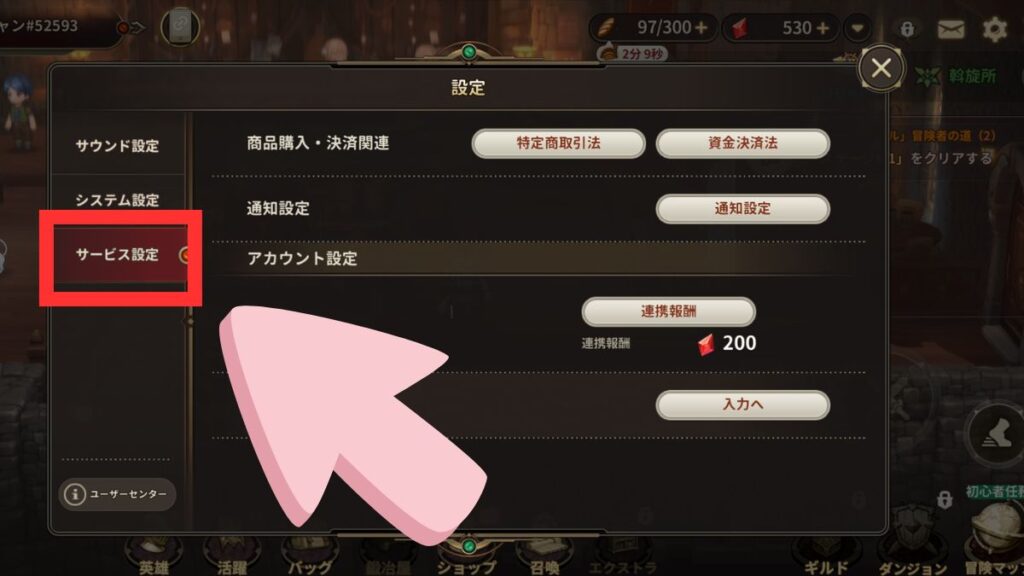 画面左にタブがあるので「サービス設定」をタップします。