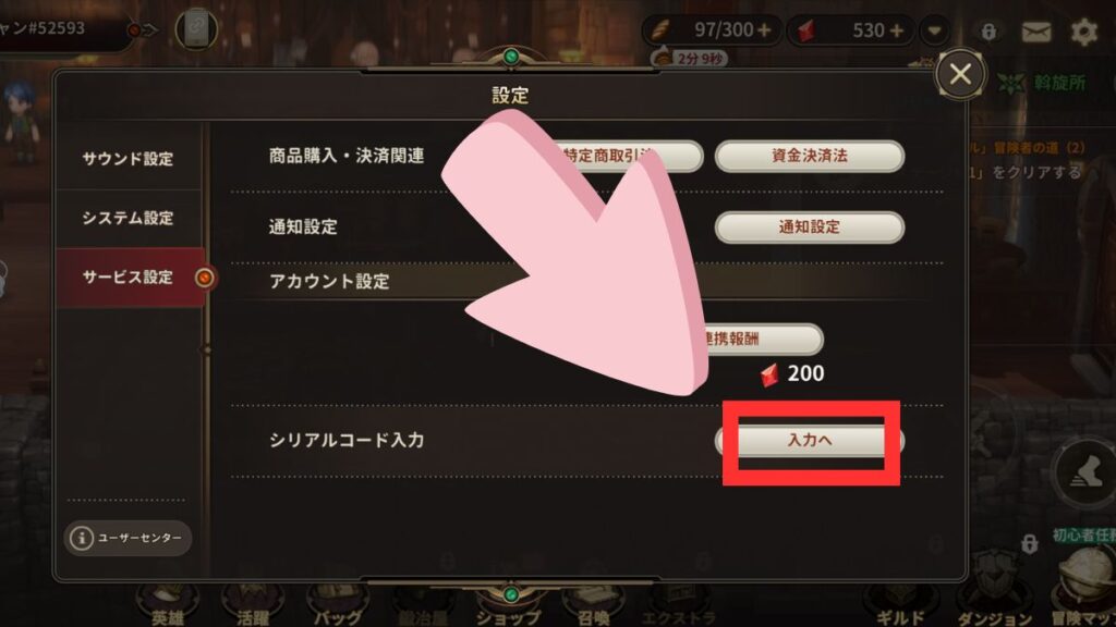 シリアルコード入力をタップ