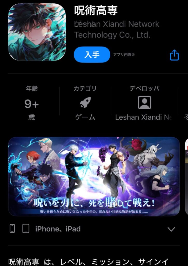 ちなみに、登場人物も見た目が呪術廻戦と一緒ですので、特級呪術師のようなパクリゲームの内容と思われます。