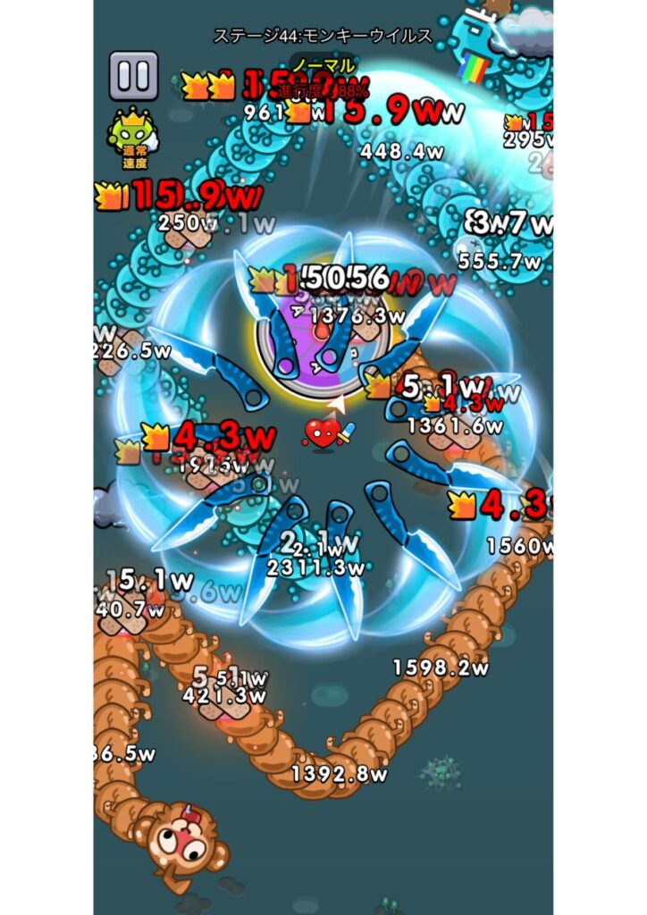 44章では「回転ダガー」と「大型メス」の強化がクリアの鍵となるので、中盤までに強化できない場合は「やり直し」かコインを買ってキャラレベル上げてきましょう。