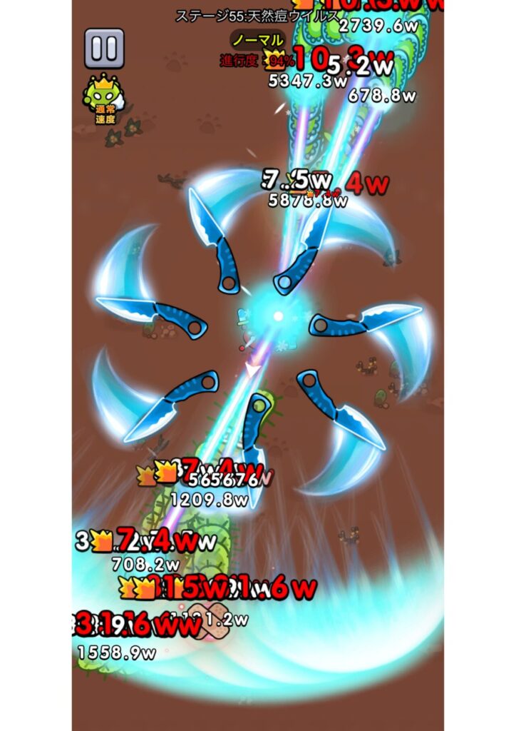 55章では「回転ダガー」と「大型メス」の強化がクリアの鍵となるので、中盤までに強化できない場合は「やり直し」かコインを買ってキャラレベル上げてきましょう。
