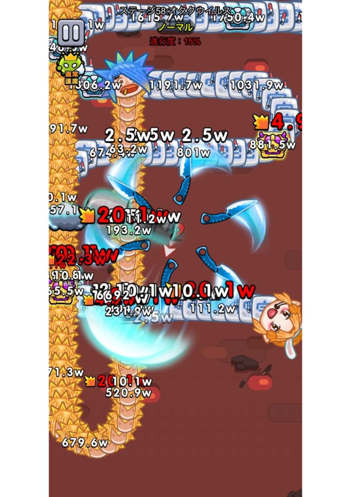 58章では「回転ダガー」と「大型メス」の強化がクリアの鍵となるので、中盤までに強化できない場合は「やり直し」かコインを買ってキャラレベル上げてきましょう。