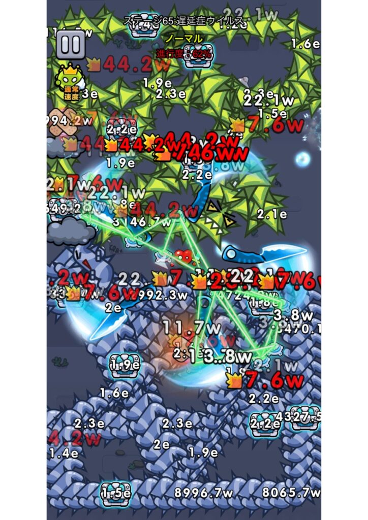 消毒バブルは発射数とダメージを強化して「クールタイム短縮」を獲得すると強力な武器になり、押し切られる前に先頭を破壊してくれます。