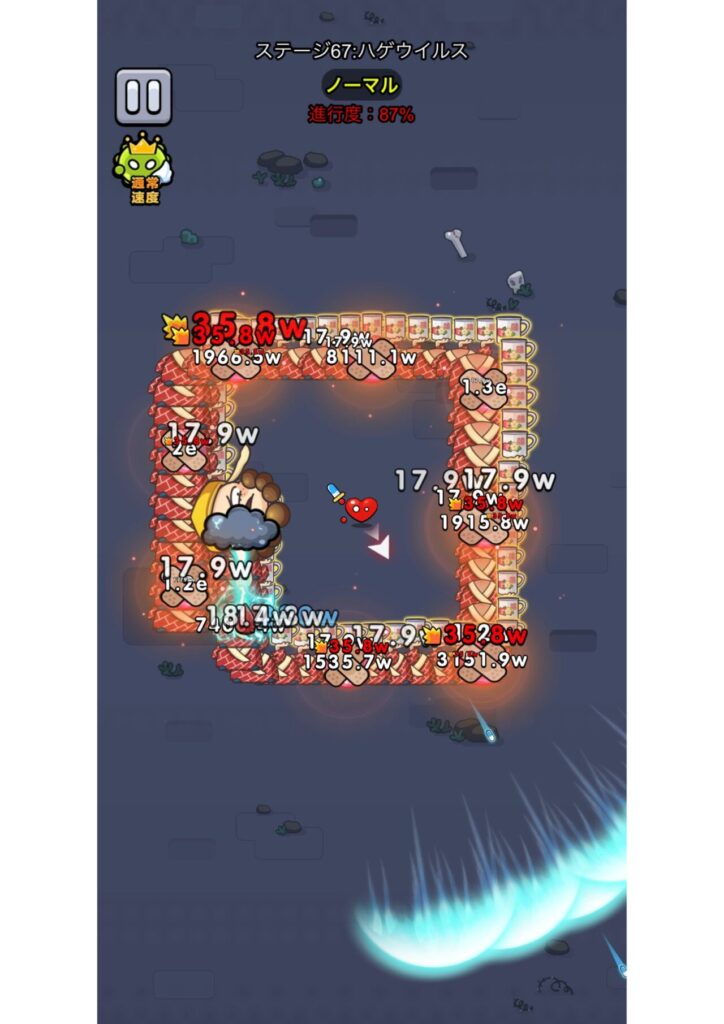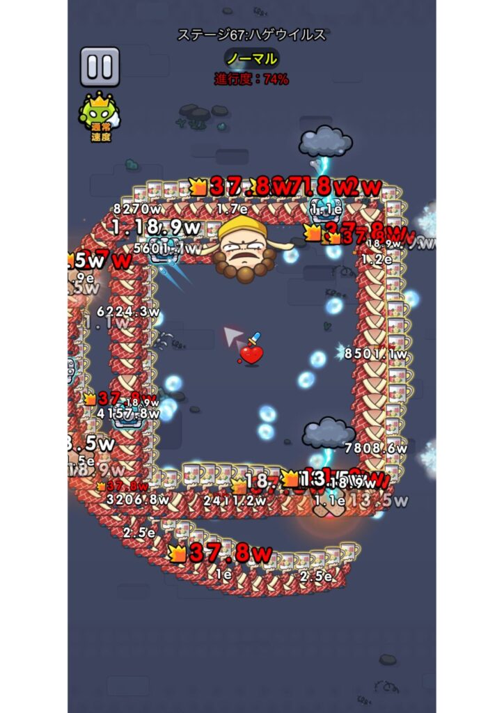 消毒バブルパターンの場合は、発射数とダメージを強化して「クールタイム短縮」を獲得すると全弾命中する超強力な武器になり、押し切られる前に先頭を破壊してくれます。