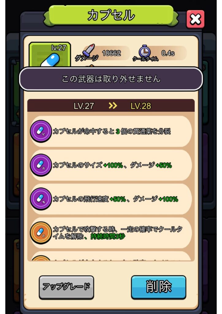 一応、レジェンドステータス強化の「ウィルスの速度20%減」が活躍する時もありますが、攻略必須能力ではない為、おすすめの武器がカプセルにはなりません。