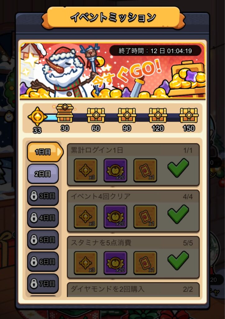イベントミッションでは、タスクを完了すると報酬が獲得できます。