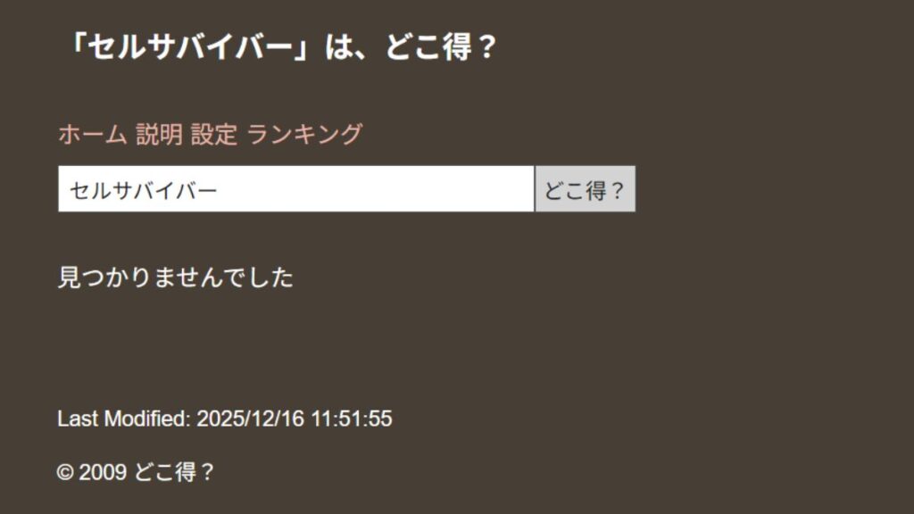 理由は、検索サイト「どこ得」でセルサバイバーと検索しても「ポイ活案件」は出ていないことが分かったからです。