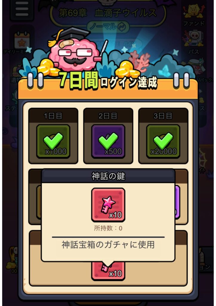 「神話宝箱はどこにあるの?」と言った検索が増えた理由は『7日間ログインボーナス』で獲得できる「神話の鍵×10」が原因となります。