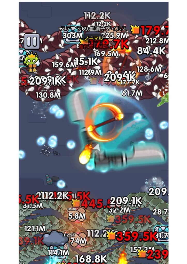 消毒バブルパターンの場合は、発射数とダメージを強化して「クールタイム短縮」を獲得すると全弾命中する超強力な武器になり、押し切られる前に先頭を破壊してくれます。